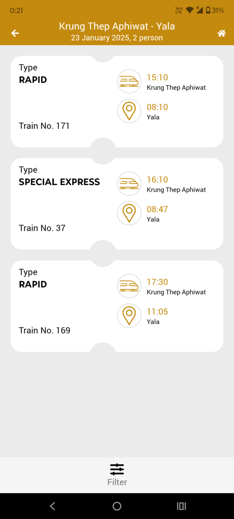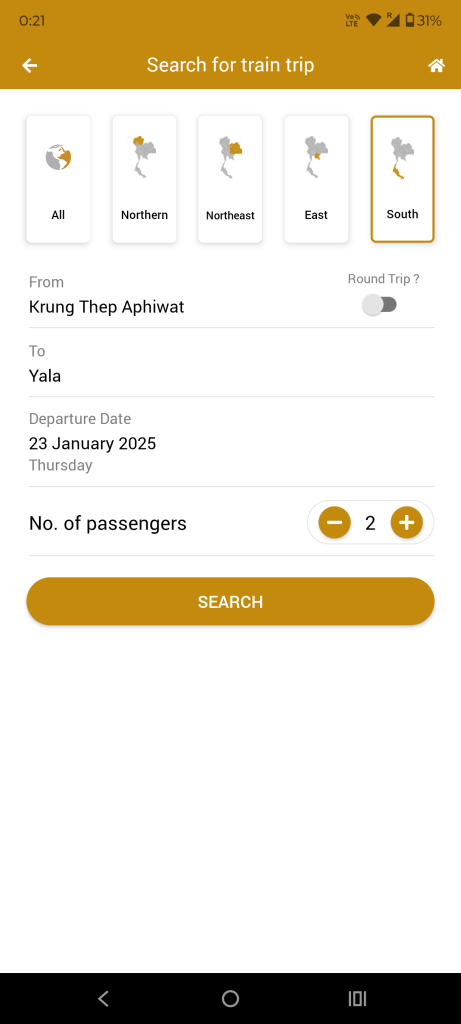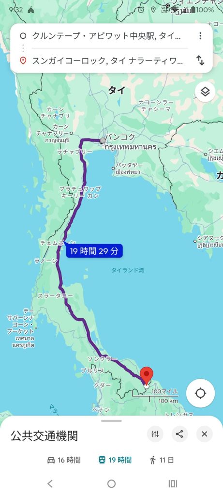 バンコクからヤラー行きの列車が表示されます