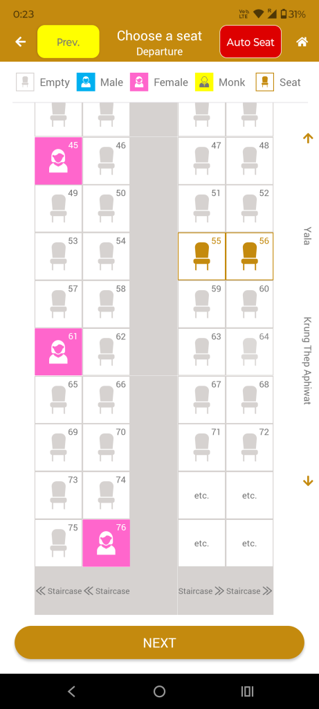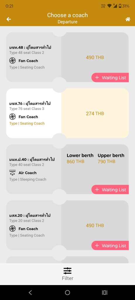 セカンドクラス 扇風機の車両 シート席 490バーツ ウェイティングリスト